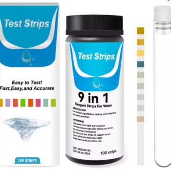 TEST DE TIRAS PARA ACUARIO DE 100 UND 9 en 1, CON TUBO ENSAYO PH_CU_CLORINE_NITRATE_CARBONATE_ALKALINITY_IRON_NITRITE_HARDENES
