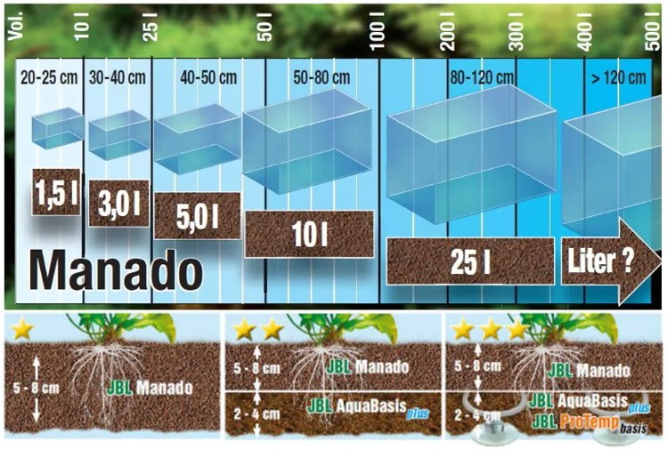 Para acuarios High tech o de plantas exigentes usar por debajo del Manado un sustrato nutritivo como el JBL Aquabasis plus o el JBL ProFloraStart.